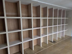 この度、経費削減の一環で事務所を引っ越しすることになりました。と言っても自社ビルの1階→4階へ移動するだけですが…いろいろ準備が多く思ったより大変な作業です。まずは倉庫として使用していた4階の内装工事ですが、写真の通り壁一面の資料棚を作りました。これまで作成した印刷物の資料数千点を収納するとなると、壁一面でも足りないぐらいです。続いて蛍光灯やコンセントの電気工事と、電話・インターネット・FAXの配線ができればいよいよ引っ越しで、2025年12月末頃を予定しております。時代の流れにともない当社は大きな転換期を迎えております。経費削減、事業の継続、そして事業転換と大忙しの近況です。